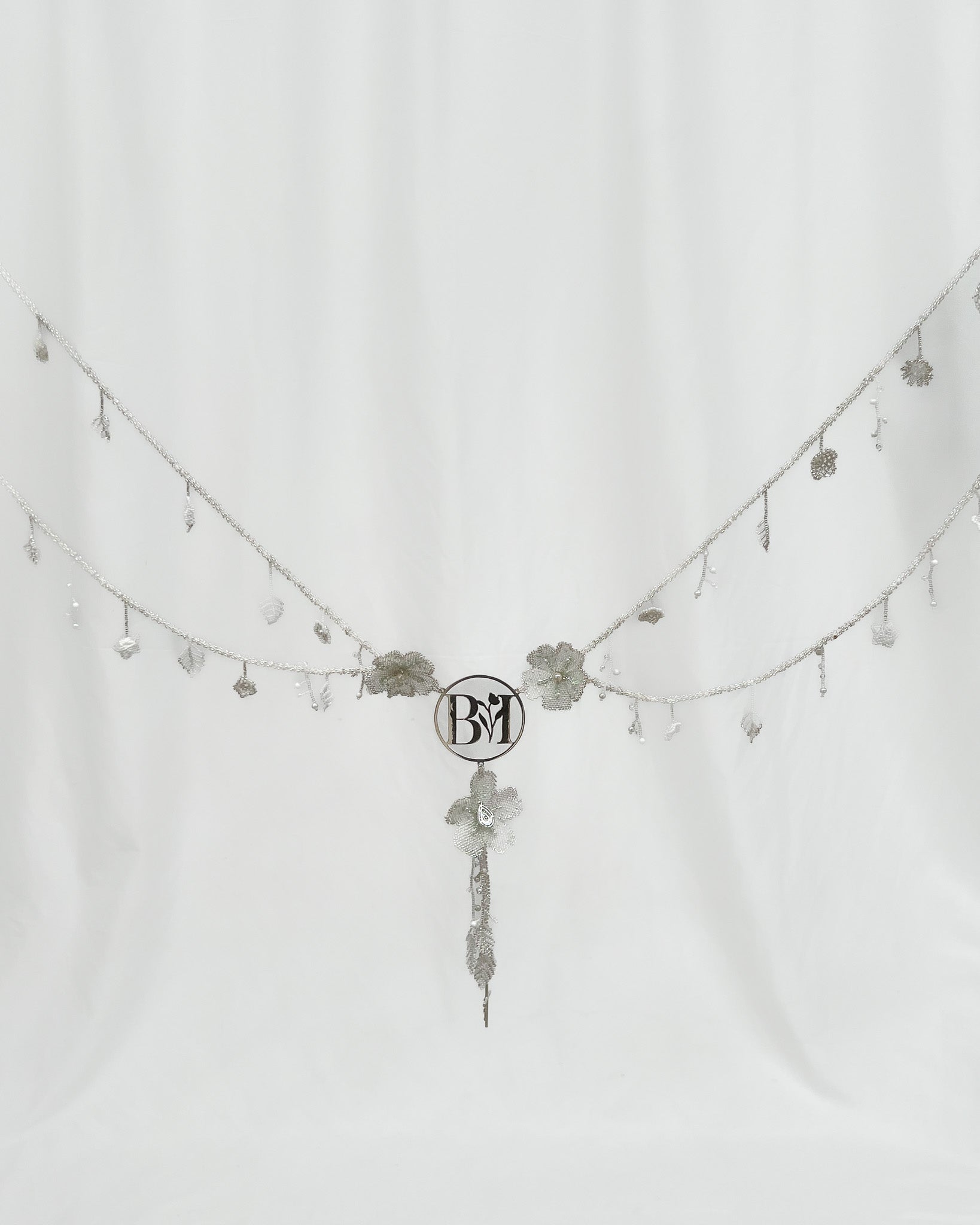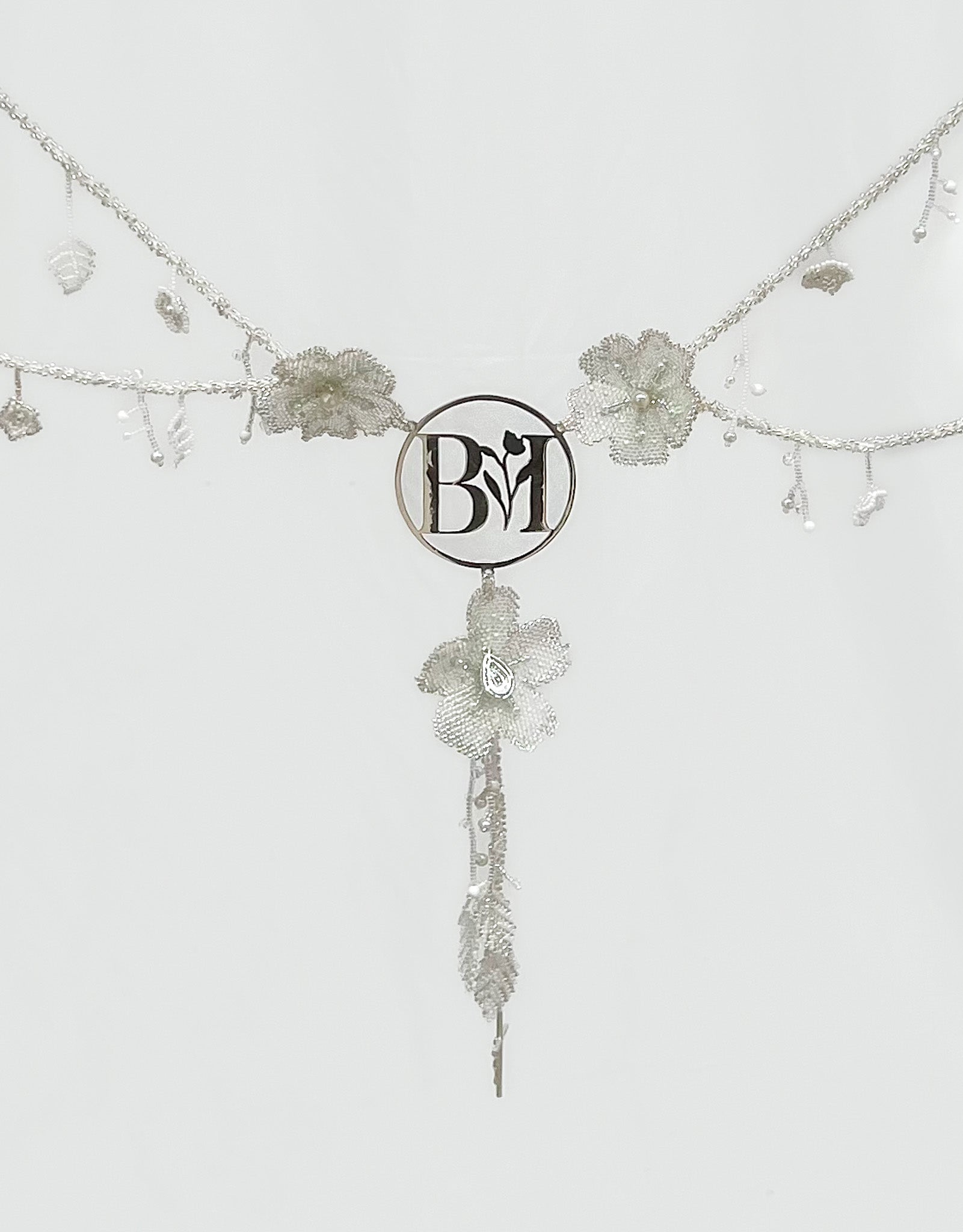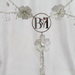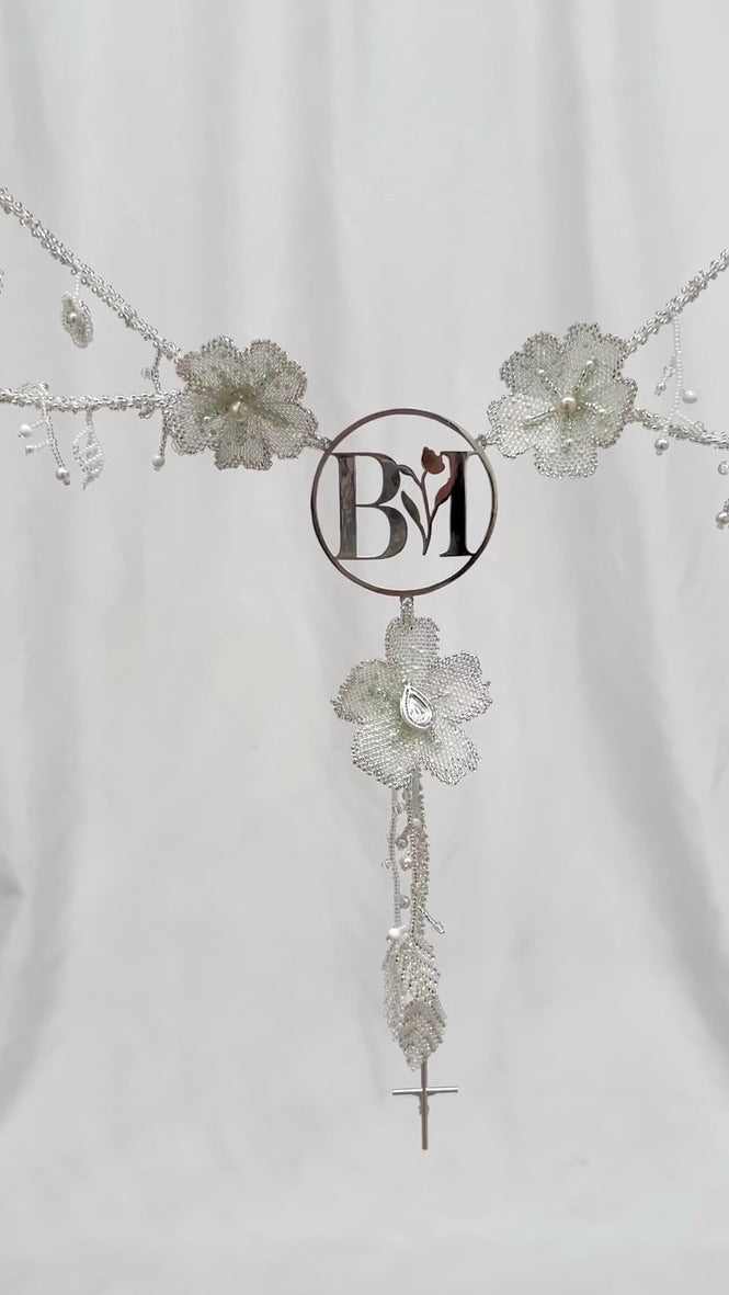 Este lazo presenta flores en 3D y detalles meticulosamente bordados a mano, mientras que el centro resalta con iniciales personalizadas en plata .925, capturando la esencia única de los novios.